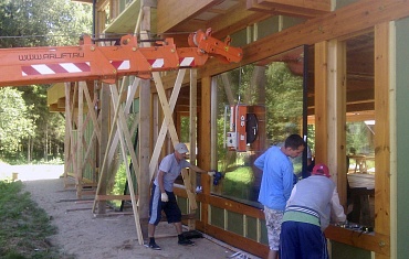На территории строящегося жилого комплекса происходил сложный монтаж радиусных стеклопакетов с помощью вакуумного захвата ARLIFTER GS-R-600