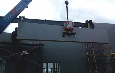 Монтаж панелей вакуумных захватом ARLIFTER SP-4 при строительстве склада в городе Новосибирск