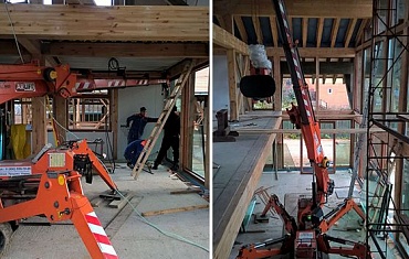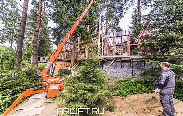 Мини-кран Jekko. Монтаж металлического каркаса и деревянных балок при строительстве коттеджа. Коттедж расположили в сосновом бору, не меняя природный ландшафт. Не одно дерево не пострадало.