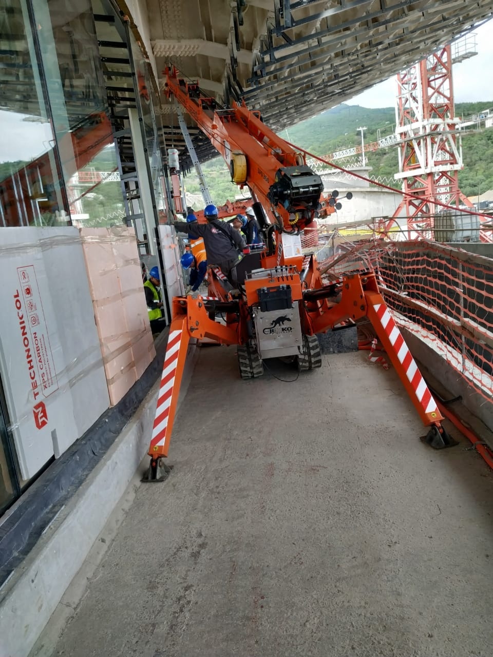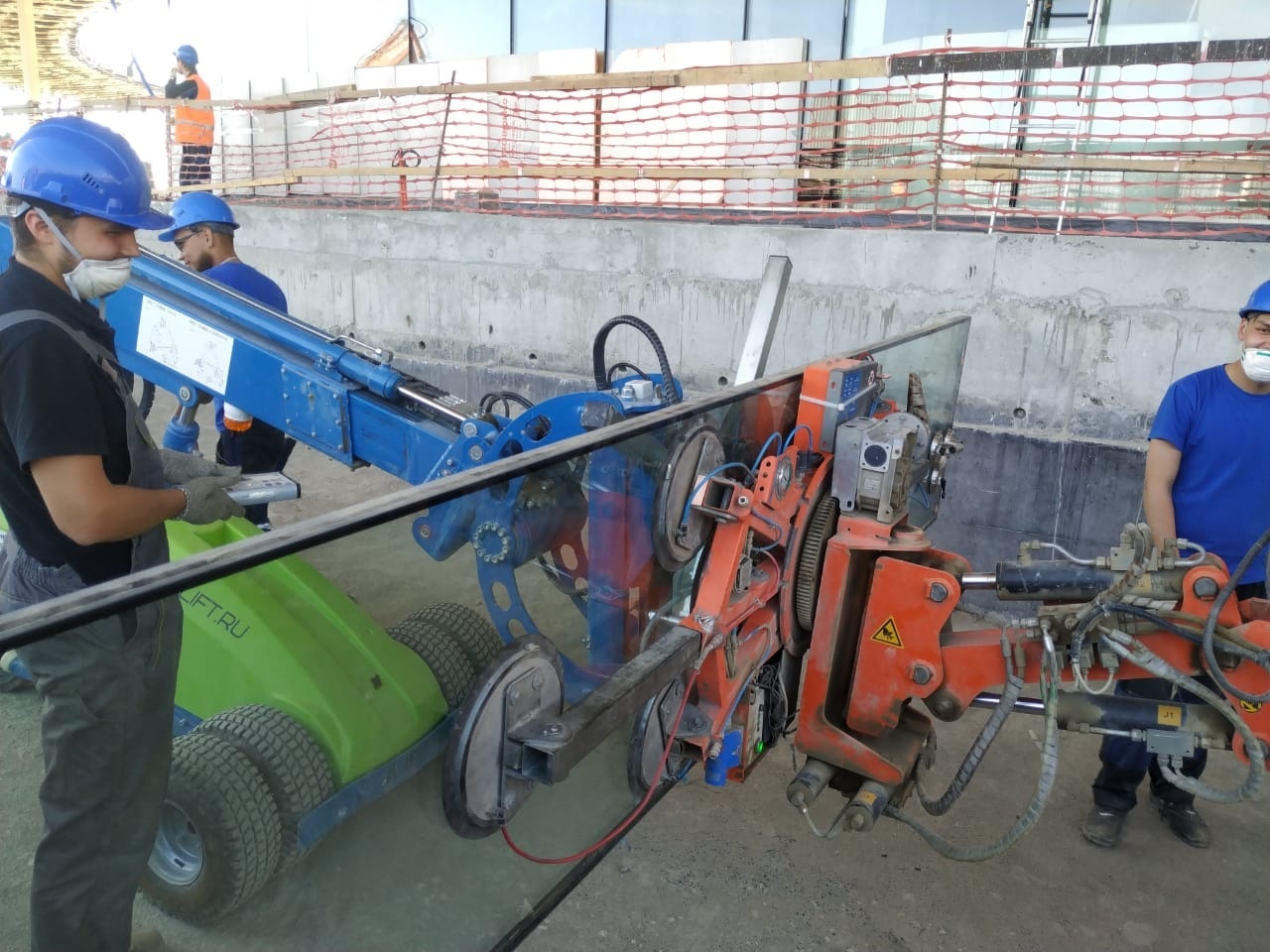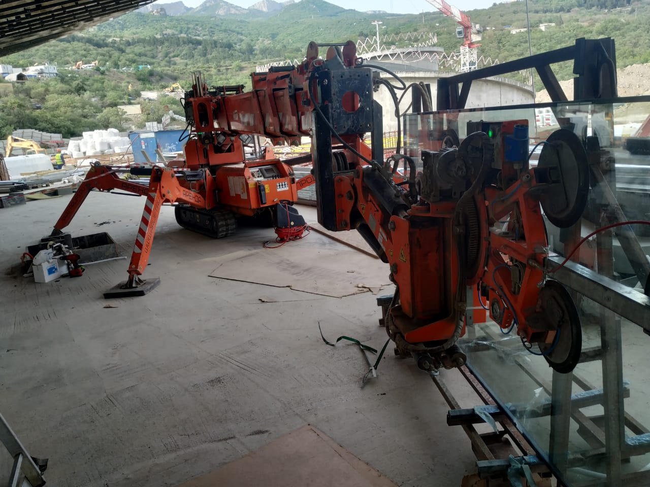 Несмотря на то, что обычно мини-кран работает в тандеме с вакуумным оборудованием, нельзя не отметить успешное сотрудничество и со стеклороботом. Маневренный, компактный, разработанный как для перевозки, так и для монтажа гладких поверхностей, он стал надежным помощником при выполнении работ.  Помимо перевозки груза, стеклоробот имеет свой фронт работ и осуществляет монтаж стекол весом до 575 кг.