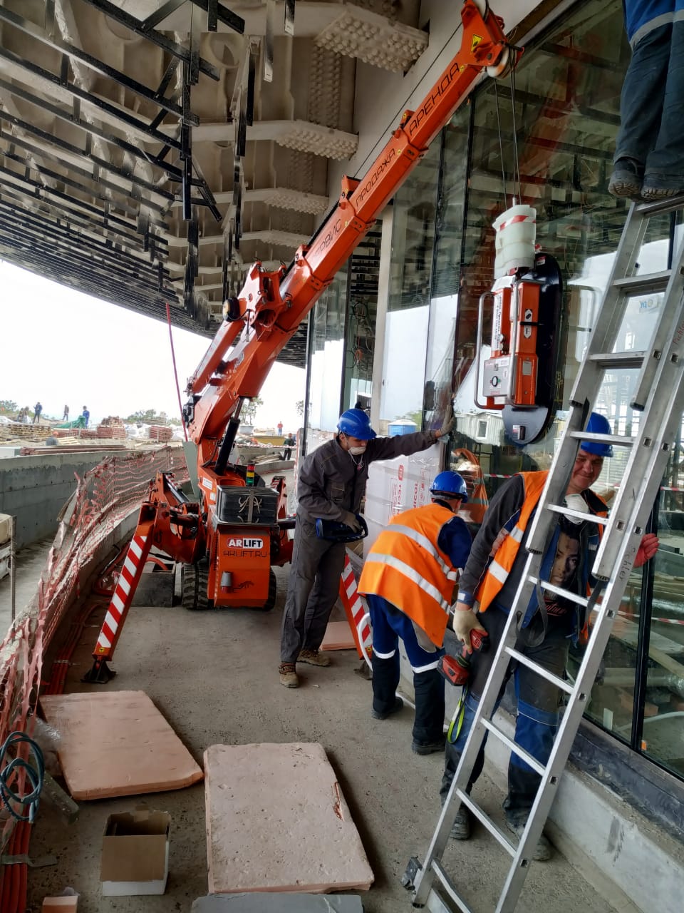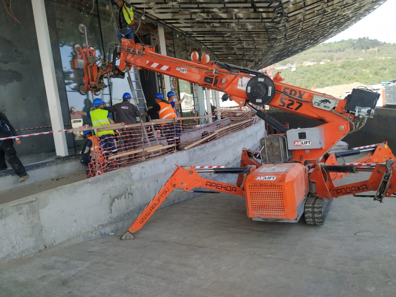 С этими задачами справляются сразу 2 вида техники из линейки Арлифт: мини-кран SPХ527 и стеклоробот Winlet 575, главная задача которых, монтаж стекла весом от 150 кг до 650 кг. Причем высота некоторых стеклопакетов достигает 5 метров, а ширина до 2,5 метров.