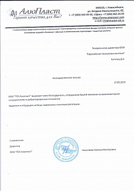 Благодарственное письмо от ООО "ПСК Алюпласт"