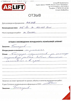 Отзыв о возведении фундамента компанией АРЛИФТ