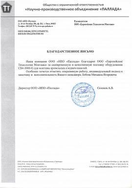 Благодарственное письмо от ООО "НПО "Паллада""